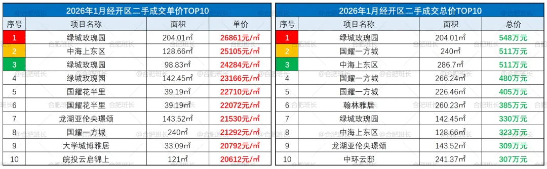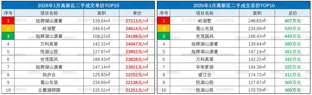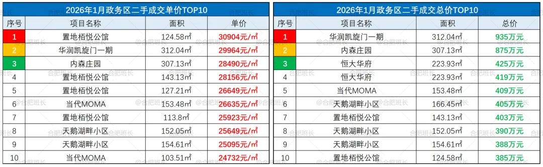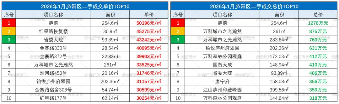 ▲26年1月庐阳区成交单价、总价TOP10
