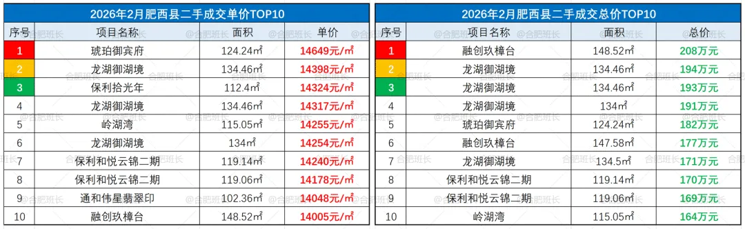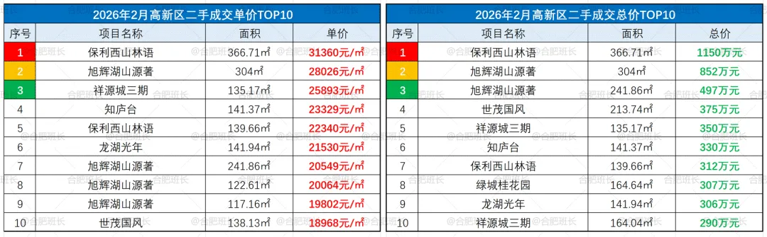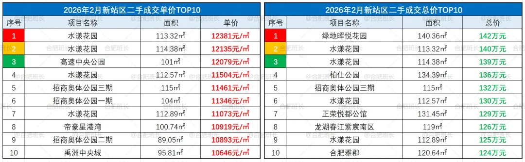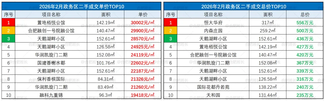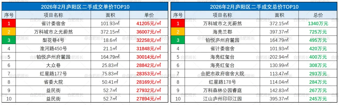 ▲26年2月庐阳区成交单价、总价TOP10