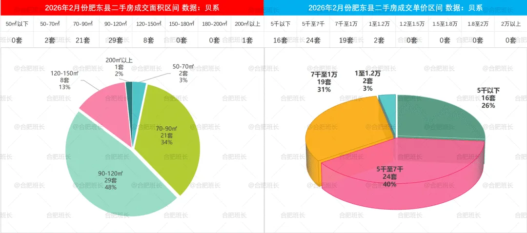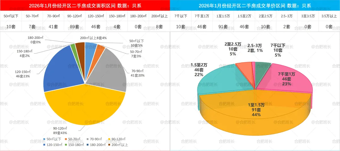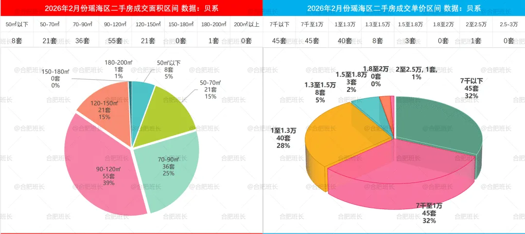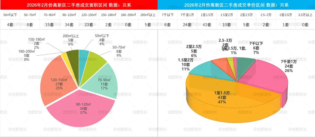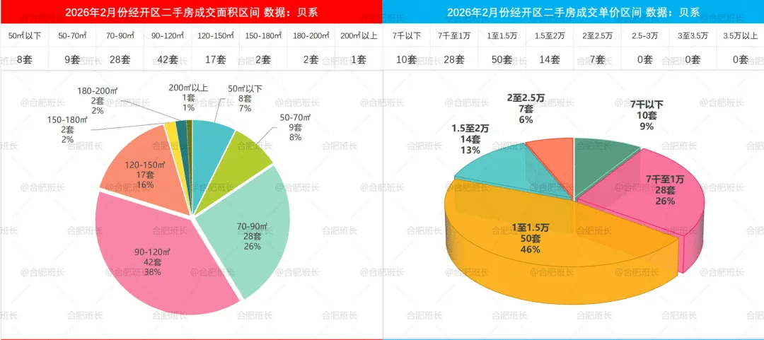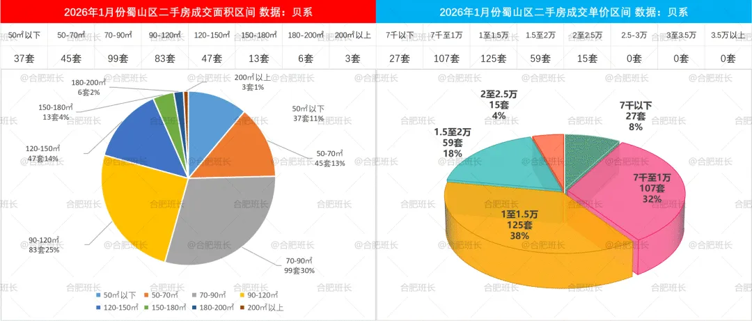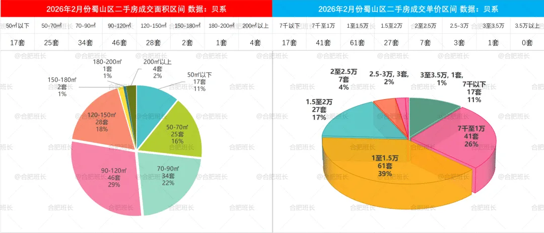 2026年1-2月二手房成交面积和单价区间,蜀山区70-90平与90-120平成交占比相近,单价方面7千至1万、1至1.5万、1.5至2万区间都有很多选择。