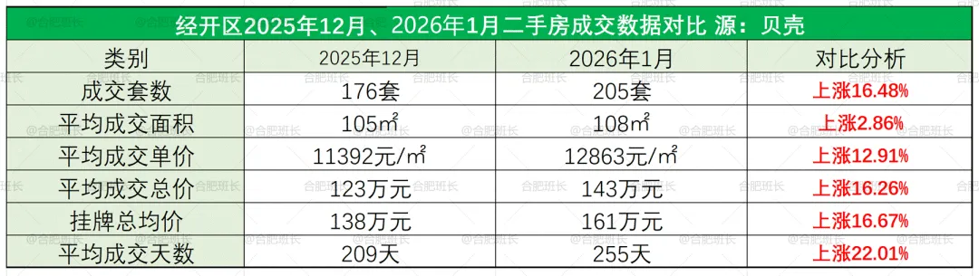 经开区26年1月份共成交205套二手房,均价12863元/㎡,平均成交总价143万、面积108平米,销量涨幅16.48%,均价涨幅12.91%。
