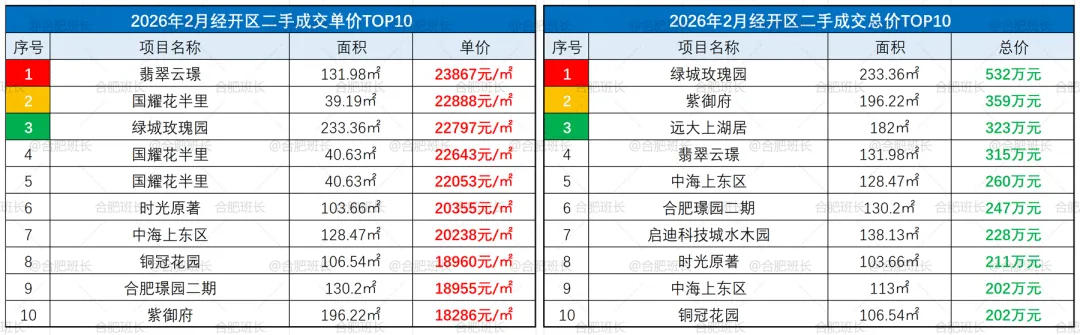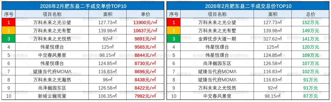 ▲26年2月肥东县成交单价、总价TOP10