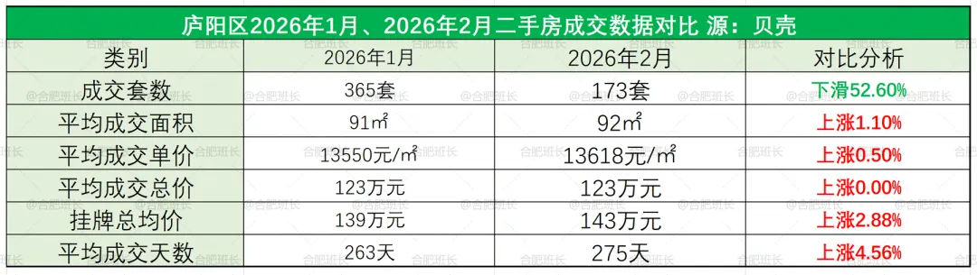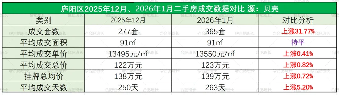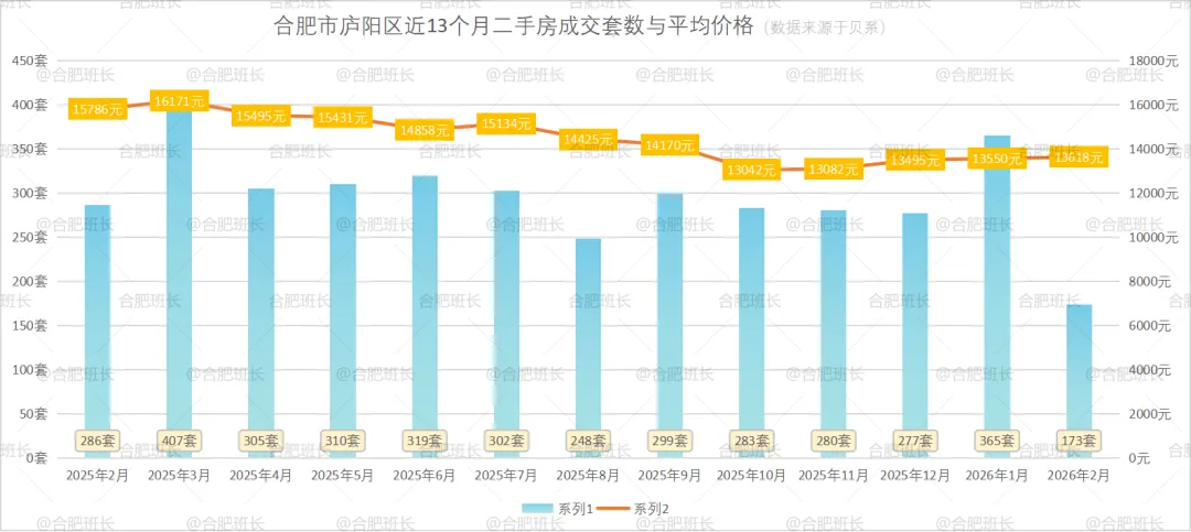 从近13个月成交数据看,2026年庐阳区开年数据在正常区间,高于去年月平均成交量。