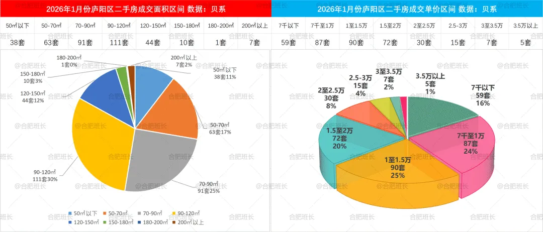 2026年1-2月二手房成交面积和单价区间,庐阳区50-70平、70-90平、90-120平成交量均较可观,单价方面分布也相对其他区域更均衡。