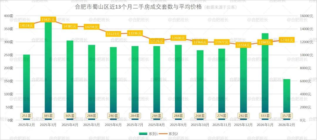 蜀山区26年2月份共成交47套二手房,均价17343元/㎡,均价上涨6.84%。