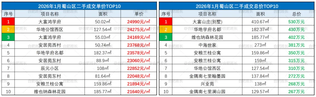 ▲26年1月蜀山区成交单价、总价TOP10
