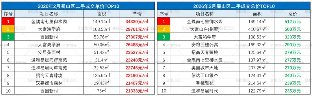 ▲26年2月蜀山区成交单价、总价TOP10