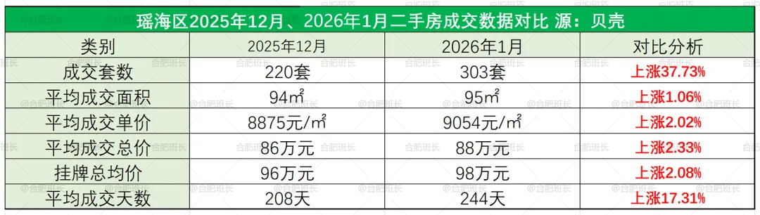 瑶海区26年1月份共成交303套二手房,均价9054元/㎡,平均成交总价88万、面积95平米,销量涨幅高达37.73%,均价也略有上涨。