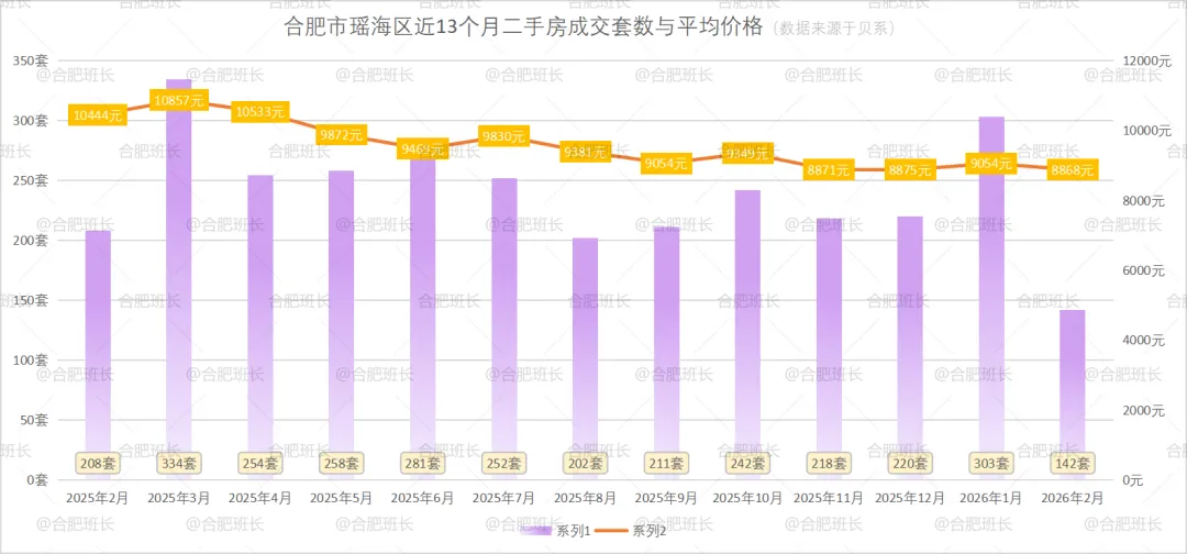 瑶海区26年2月份共成交142套二手房,均价8868元/㎡。