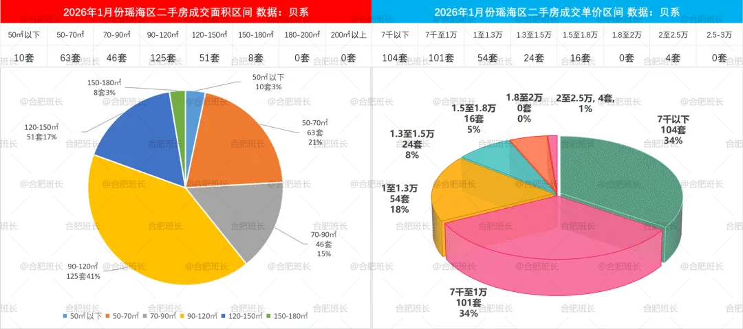 2026年1-2月二手房成交面积和单价区间,瑶海区90-120平面积区间占比较高,单价方面,7千以下和7千至1万价格区间成交量相当。