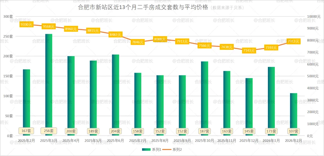 新站区26年2月份共成交107套二手房,均价7913元/㎡,均价上涨7.03%。