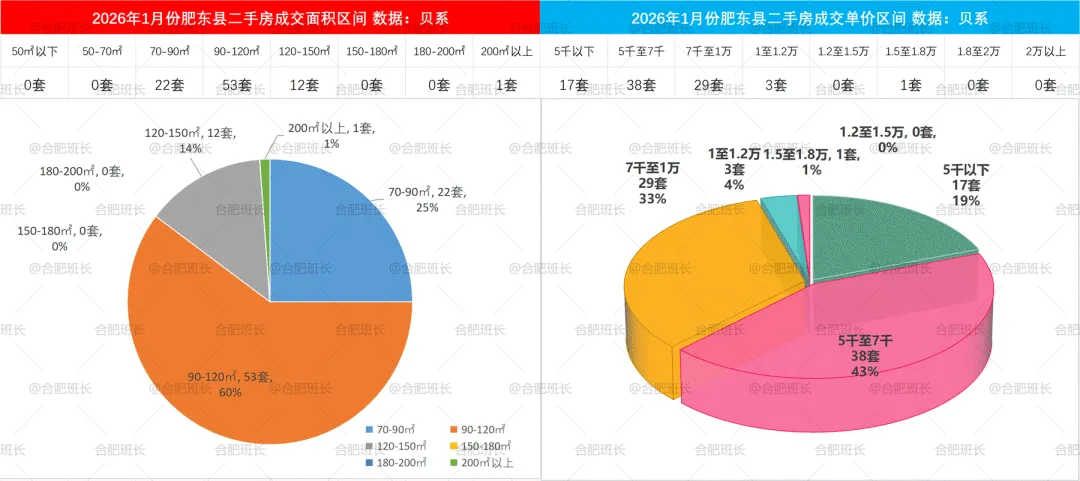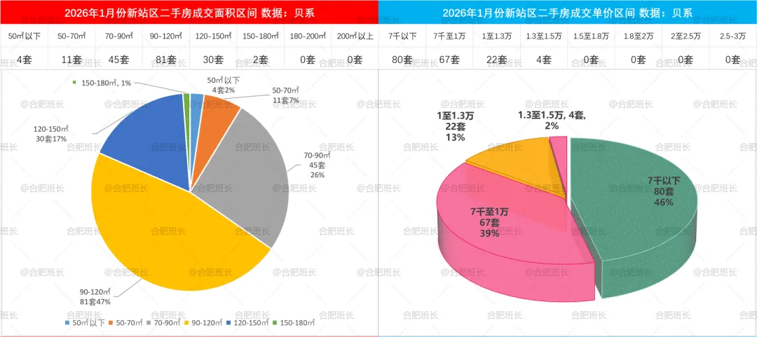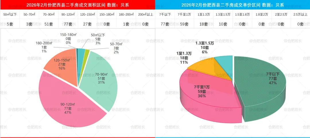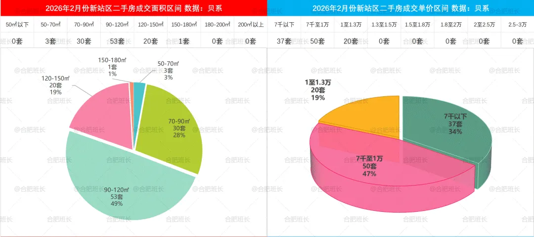 2026年1-2月二手房成交面积和单价区间,90-120平成交占比较多,其次是70-90平,120-150平成交占比也较高,单价方面7千以下为市场主力。