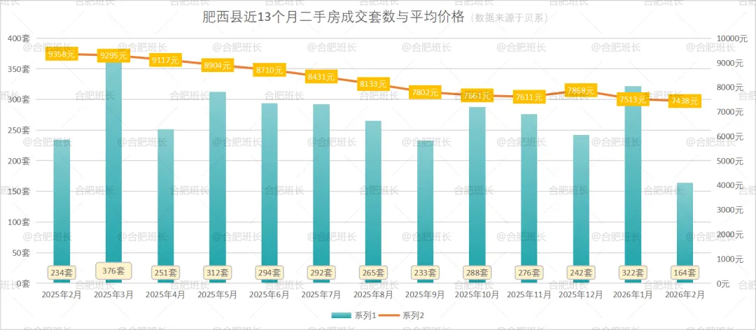 肥西县26年2月份共成交164套二手房,均价7438元/㎡。