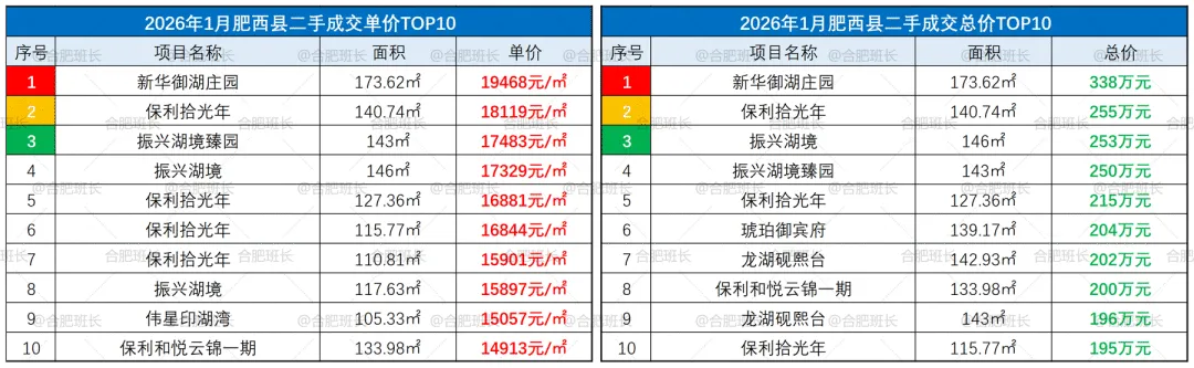 ▲26年1月肥西县成交单价、总价TOP10