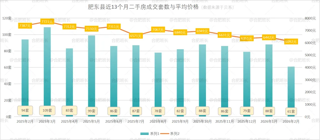 肥东县26年2月份共成交61套二手房,均价6092元/㎡。