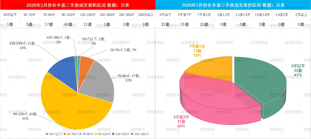 长丰县26年1月份共成交78套二手房,均价5637元/㎡,平均成交总价56万、面积99平米,销量上涨明显,不过均价再度下滑至5字头。