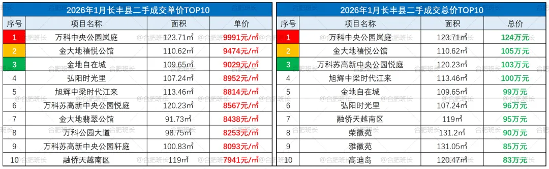 ▲26年1月长丰县成交单价、总价TOP10