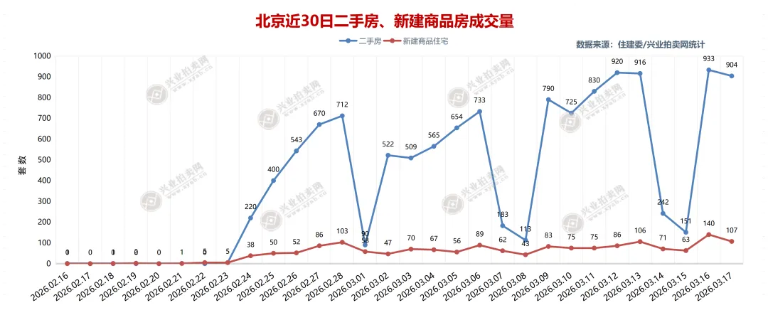 2026年3月17日北京二手房成交904套,本月累计成交9780套,其中住宅成交825套,本月住宅累计成交8869套,北京新建商品住宅成交107套,本月累计成交1298套。