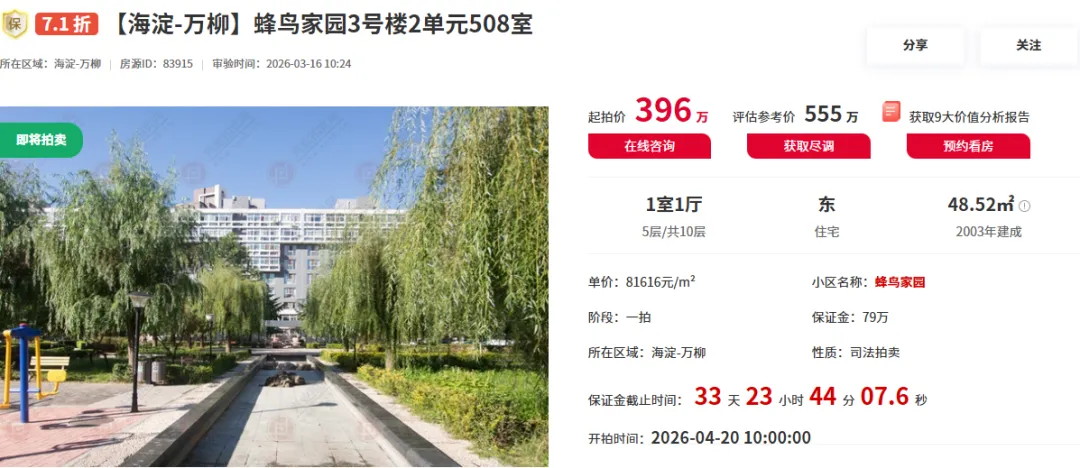 本次拍卖房产为蜂鸟家园3号楼2单元508室的住宅,建筑面积48.52平米,1室1厅格局,朝向正东,采光通透,中楼层视野与居住舒适度俱佳。此次挂拍价为396万,评估参考价约555万,相当于7.1折起拍,定于2026年04月20日10时开拍,房屋相关信息已调查完成,可联系我们获取尽调报告及预约看房!