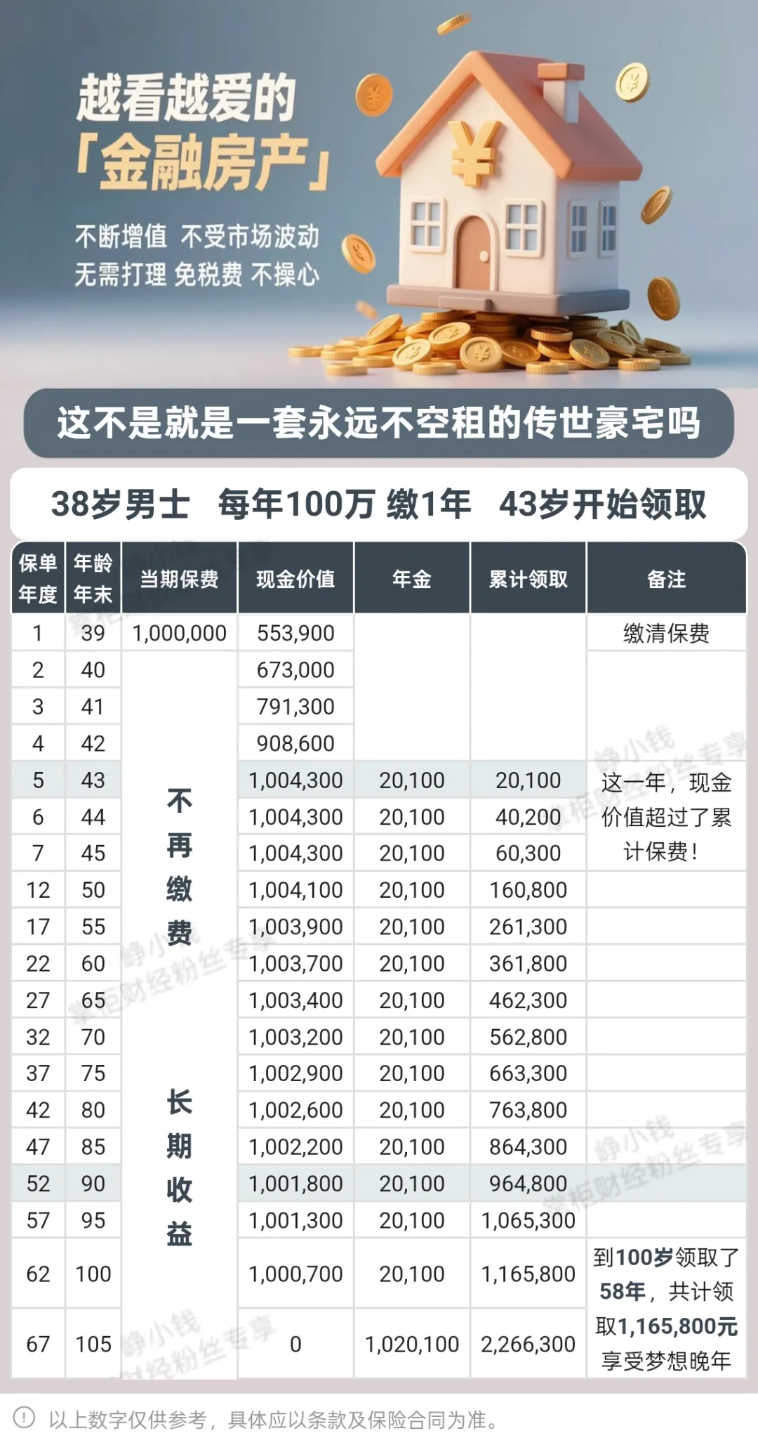 什么叫金融房产?简单来说,就是你存一笔钱进保险公司,保险公司替你把这笔钱打理好。从约定的年份开始,每年雷打不动给你发“租金”。