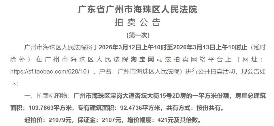 极目新闻记者在阿里法拍平台上看到,3月13日,广州市海珠区人民法院拍卖位于广州市海珠区可逸名庭小区一套房产的1平方米份额,这1平方米评估价为30112元,起拍价为21079元,有17人报名竞拍,经64次竞价,最后被一名买家以110331元拍得。这场拍卖引来2万多人围观。