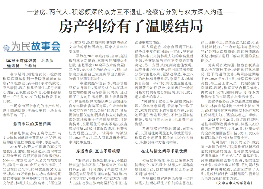 2025年9月26日,协议履行完毕。赵桂梅顺利收到手术款,林薇夫妇获得房屋完整产权。9月28日,林薇夫妇向检察院撤回监督申请。次日,武汉市检察院依法作出终结审查决定。
