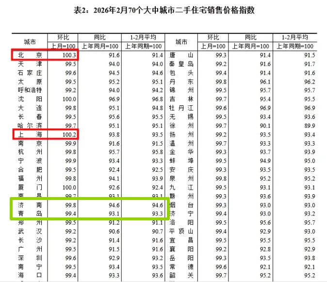 确实,在官方刚刚发布的2026年2月份70个大中城市二手房住宅销售价格走势里,