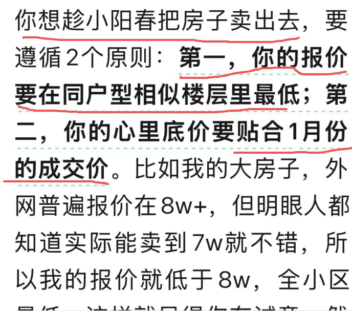 2、心理底价贴合年前1月份的成交价。想快速成交,不要幻想着小阳春热度高能涨价捞一笔,