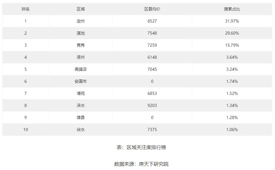 榜首的定州搜索占比为31.97%,其次是莲池和竞秀,占比分别为29.60%和15.79%。