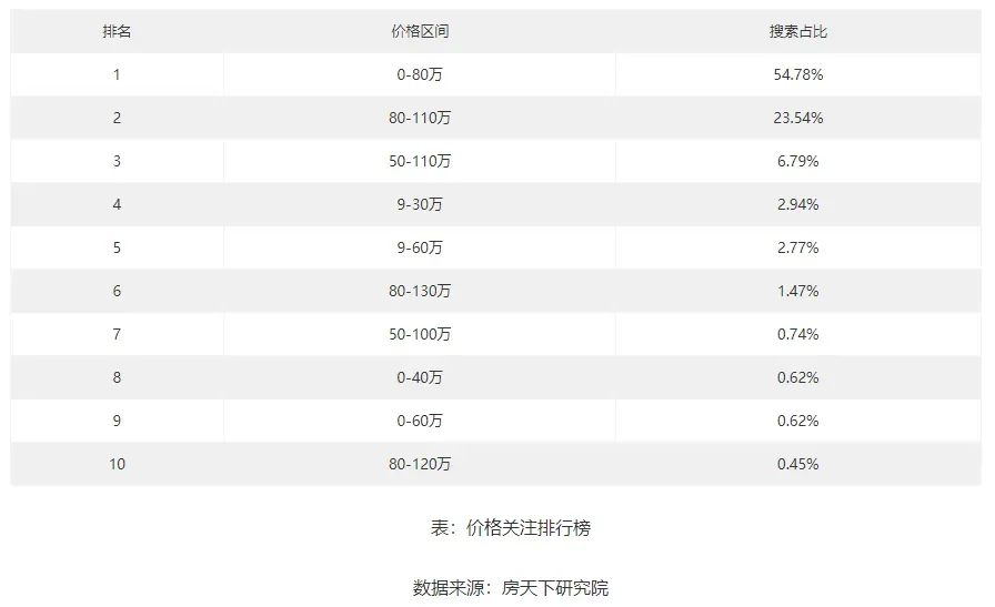 价格方面,0-80万价格区间更被网友关注,占比达54.78%;其后为80-110万,占比23.54%;50-110万搜索占比为6.79%,位居第三位。