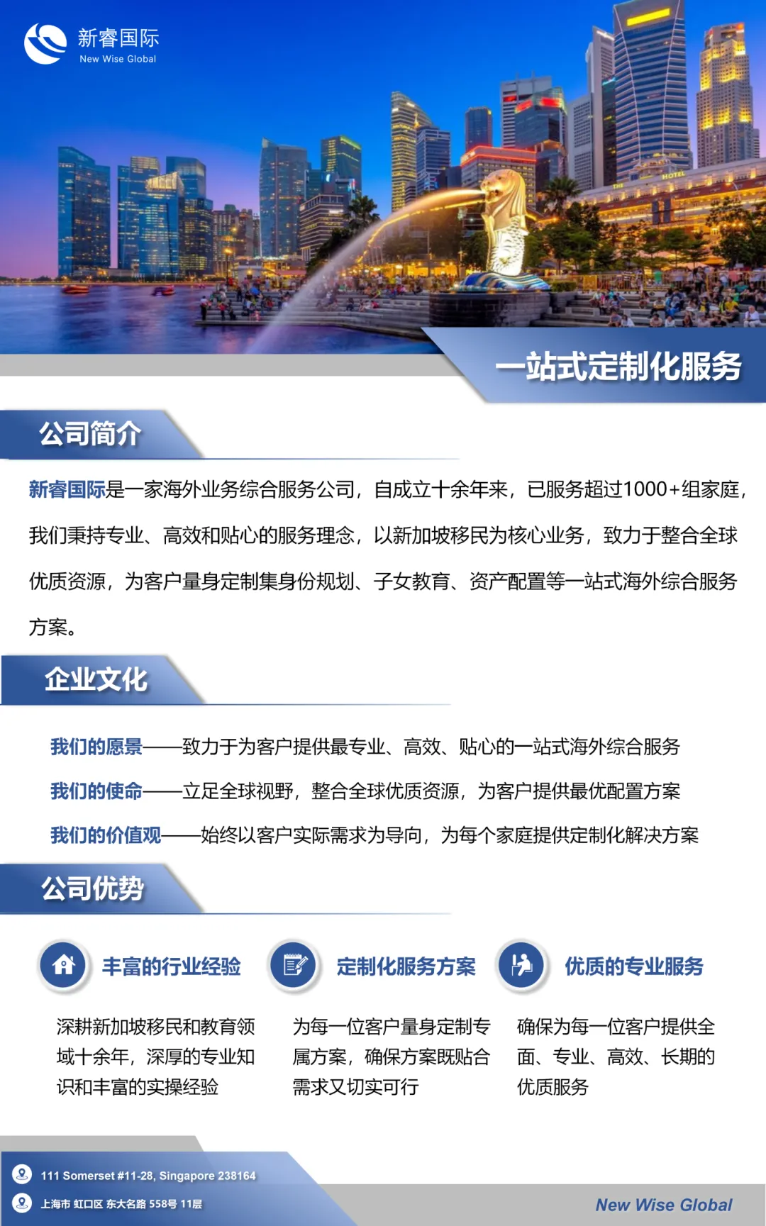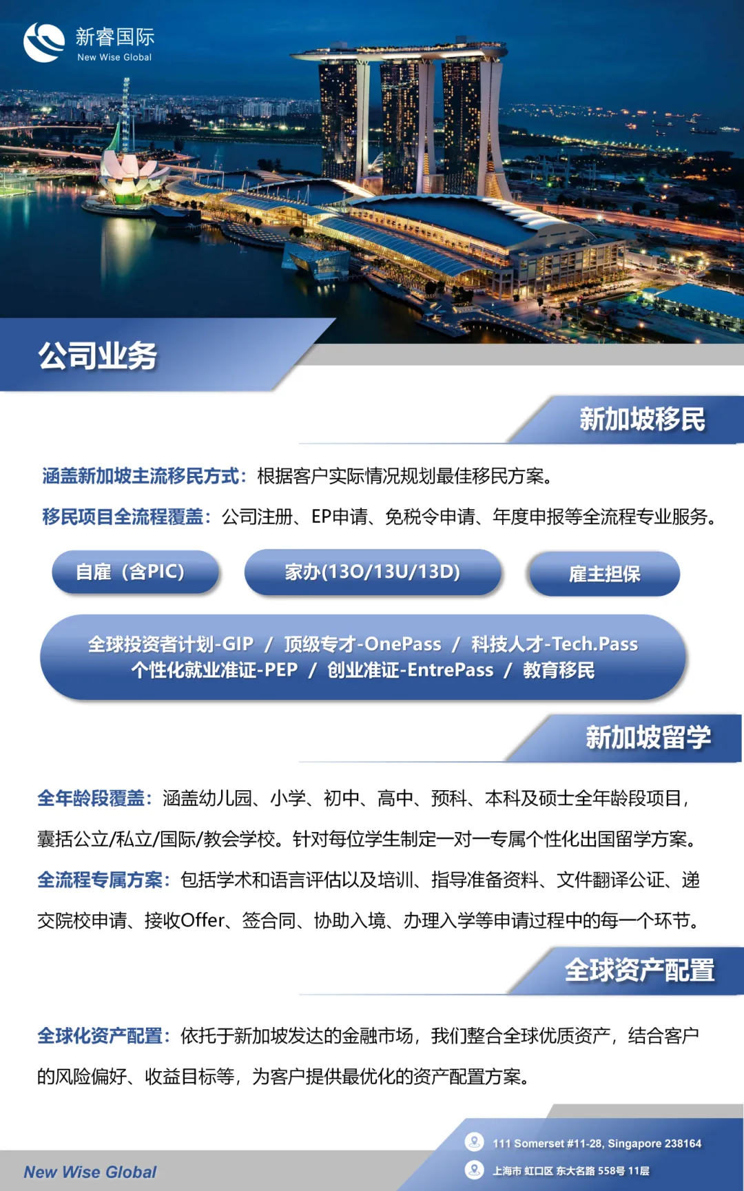 新睿国际是一家海外综合服务公司,总部位于新加坡,在上海、重庆设有分部,业务辐射大中华地区。