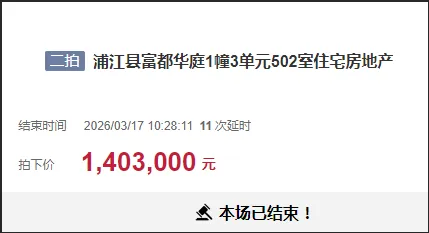 浦江县富都华庭1幢3单元502室住宅房地产一拍起拍价135万元,因无人出价而流拍;二拍起拍价115万元,最终以140.3万元成交。折合9580元/平米。▬▬▬