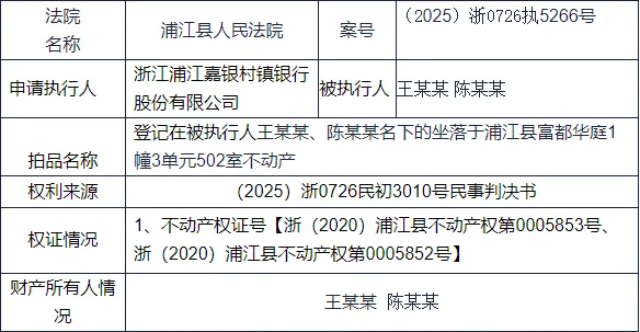 据悉:浦江县富都华庭1幢3单元502室的住宅房地产。房屋证载总建筑面积159.45平方米,其中主房建筑面积154.89平方米、附房建筑面积4.56平方米,证载土地使用权面积32.70平方米,权利类型为国有建设用地使用权,权利性质为出让。