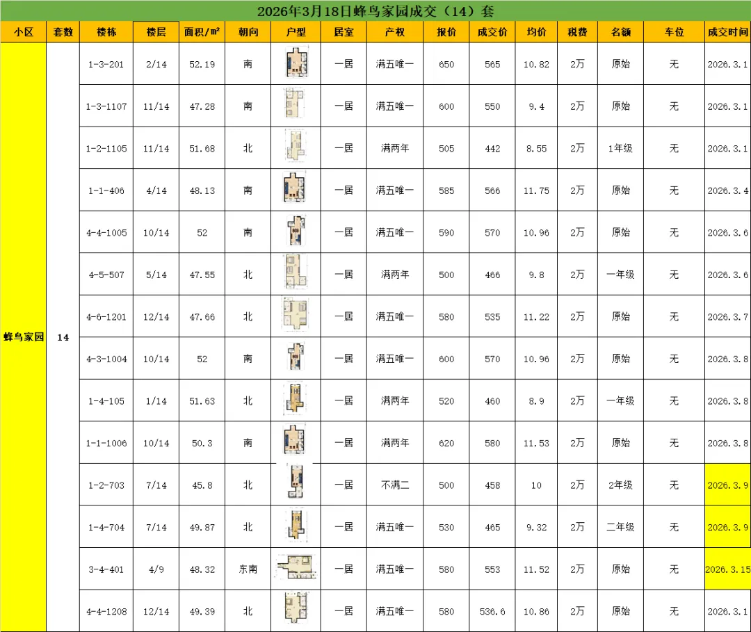 • 产品特性与需求变化:蜂鸟家园以50平米左右的开间和一居室为主,是典型的“学区占坑房”。在市场上行期,因其低总价优势备受追捧,单价一度冲上20万/㎡。但在市场下行和学区概念弱化后,其居住功能差、户型过时的缺点被放大,需求锐减。当前市场更偏好功能齐全的改善户型。