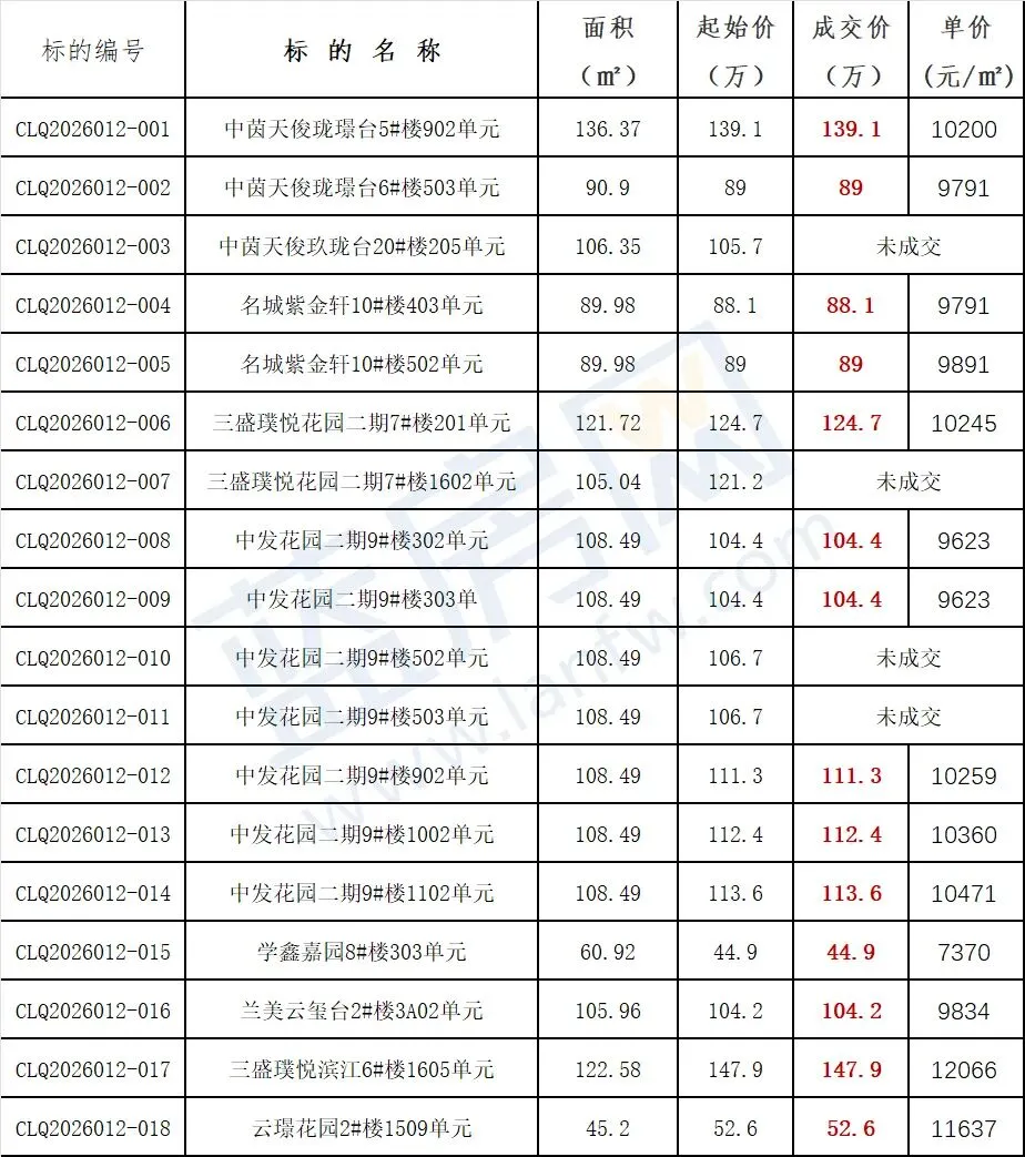 最终,其中14套房源成功以底价拍出,成交单价约7千到1.2万/平不等。