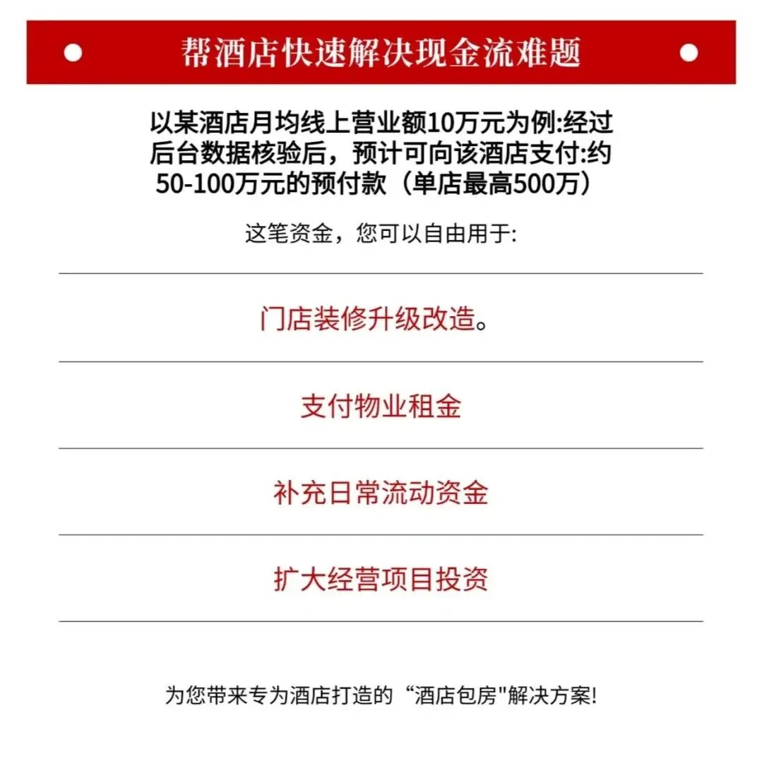 最近,我们看到一款创新性酒店贷款,这款贷款产品是基于酒店OTA流水,预付未来4-8个月房费,只看美团、携程、飞猪后台流水,不看征信、不押房产、不查负债,只锁线上收入回款,是资质略有瑕疵的酒店老板融资贷款首选。