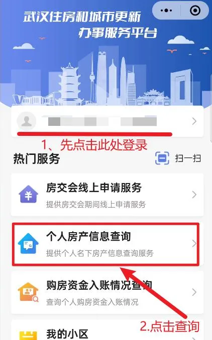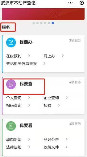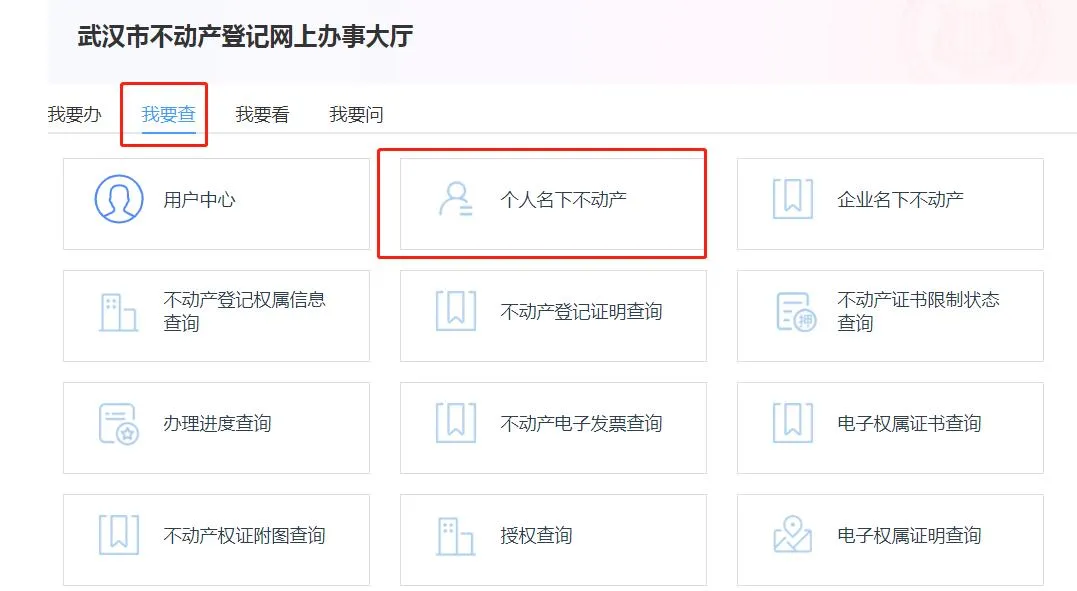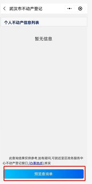 关注武汉不动产登记微信公众号,点击右下角“办事大厅”进入,登录后选择“服务—我要查”即可查询个人名下不动产,点击预览查询单即可获得结果。