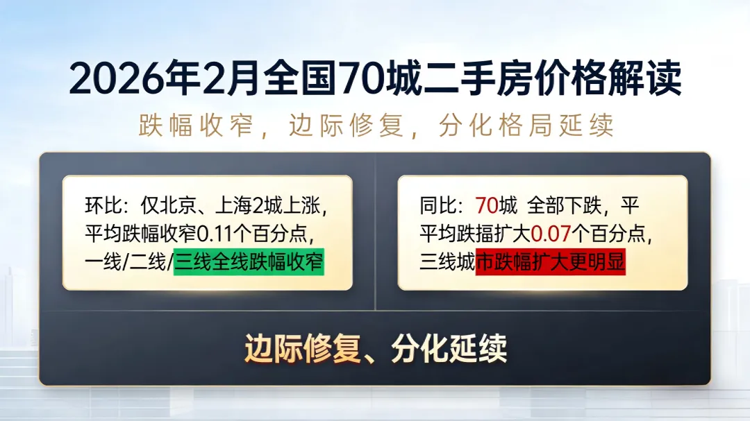 2026年2月全国70个大中城市二手房住宅价格延续了2025年以来的调整态势,但整体跌幅逐步收窄,市场呈现出“环比修复、同比仍探底,核心城市韧性凸显、三线城市调整压力延续”的分化特征。本文从全国总体涨跌、分区域重点城市表现两个维度,对2026年2月二手房价格变动情况进行梳理分析,研判当前二手房市场的运行特征。