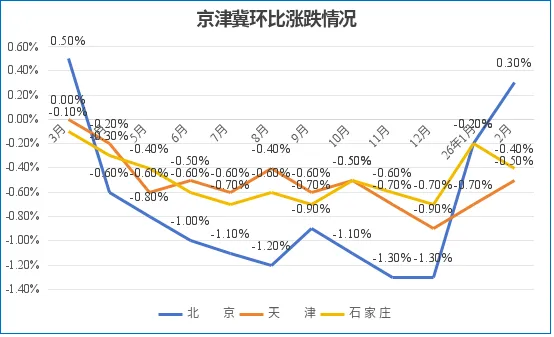 2月:北京环比上涨0.3%,天津环比跌幅收窄0.2个百分点至-0.5%,石家庄跌幅扩大0.2个百分点至-0.4%。