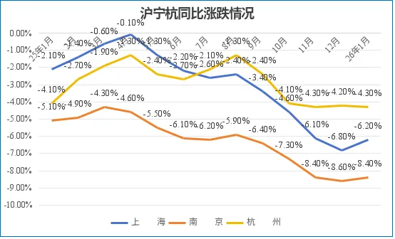 2月,上海同比跌幅收窄0.6个百分点至-6.2%;南京同比跌幅收窄0.2个百分点至-8.4%;杭州同比跌幅扩大0.1个百分点至-4.3%。