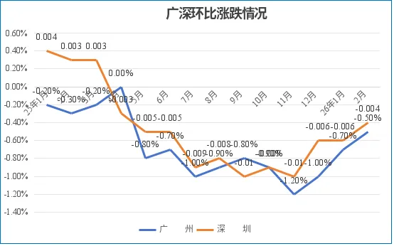 2月,广深房价环比跌幅同步收窄,其中广州环比收窄0.2个百分点至-0.5%;深圳环比收窄0.2个百分点至-0.4%。