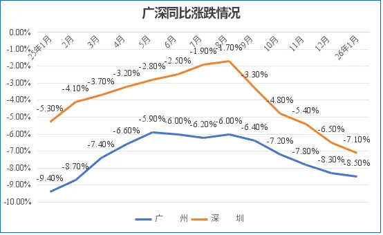 2月,广深房价同比跌幅扩大。其中,广州跌幅扩大0.2个百分点至-8.5%;深圳跌幅扩大0.6个百分点至-7.1%。