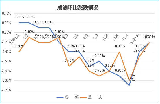 2月,成渝地区房价环比跌幅收窄。其中,成都跌幅收窄0.2个百分点至-0.2%;重庆跌幅收窄0.3个百分点至-0.2%。