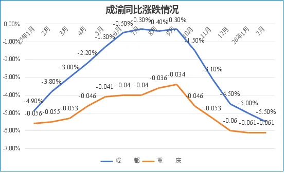 2月,成渝两地房价同比跌幅继续扩大。其中,成都同比跌幅扩大0.5个百分点至-5.5%;重庆同比跌幅与上月持平,为-6.1%。