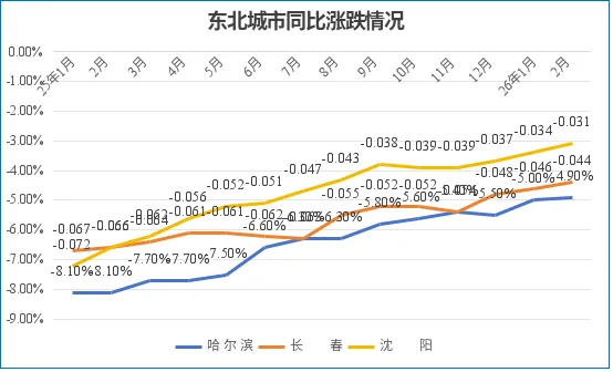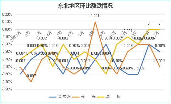2月,沈阳房价环比止跌;长春环比跌幅扩大0.1个百分点跌至-0.3%;哈尔滨环比跌幅扩大0.3个百分点,跌至-0.5%。