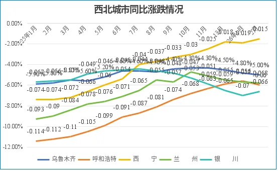 2月,西北地区房价环比分化,其中西宁环比跌幅收窄0.2个百分点至-0.2%;兰州环比跌幅收窄0.5个百分点至-0.2%;银川环比跌幅收窄0.4个百分点至-0.3%;乌鲁木齐环比跌幅收窄0.1个百分点至-0.3%;呼和浩特环比跌幅扩大0.3个百分点至-0.8%。