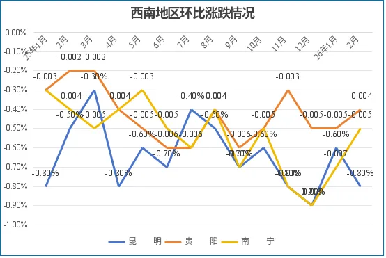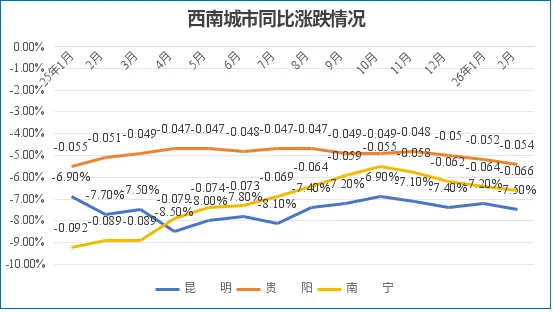 2月,贵阳、南宁环比跌幅收窄,昆明环比跌幅扩大。其中,贵阳环比跌幅收窄0.1个百分点至-0.4%;南宁环比跌幅收窄0.2个百分点至-0.5%;昆明环比跌幅扩大0.2个百分点至-0.8%。