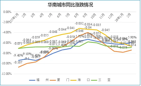 2月,华南四城房价同比全部下跌。其中,福州同比跌幅收窄0.4个百分点至-5.9%;三亚同比跌幅收窄0.1个百分点至-6.9%;厦门同比跌幅收窄0.4个百分点至-7.4%;海口同比跌幅扩大0.6个百分点至-6.7%。