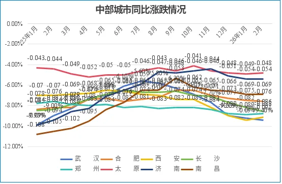 2月,中部八城环比全部下跌。其中,西安环比跌幅较小,当月环比跌幅收窄0.7个百分点至-0.1%;济南环比跌幅扩大0.1个百分点至-0.2%;南昌环比跌幅收窄0.7个百分点至-0.3%;太原、合肥环比跌幅收窄0.1个百分点至-0.5%;郑州环比跌幅收窄0.2个百分点至-0.5%;武汉环比跌幅扩大0.2个百分点至-0.9%;长沙环比跌-0.8%与上月持平。