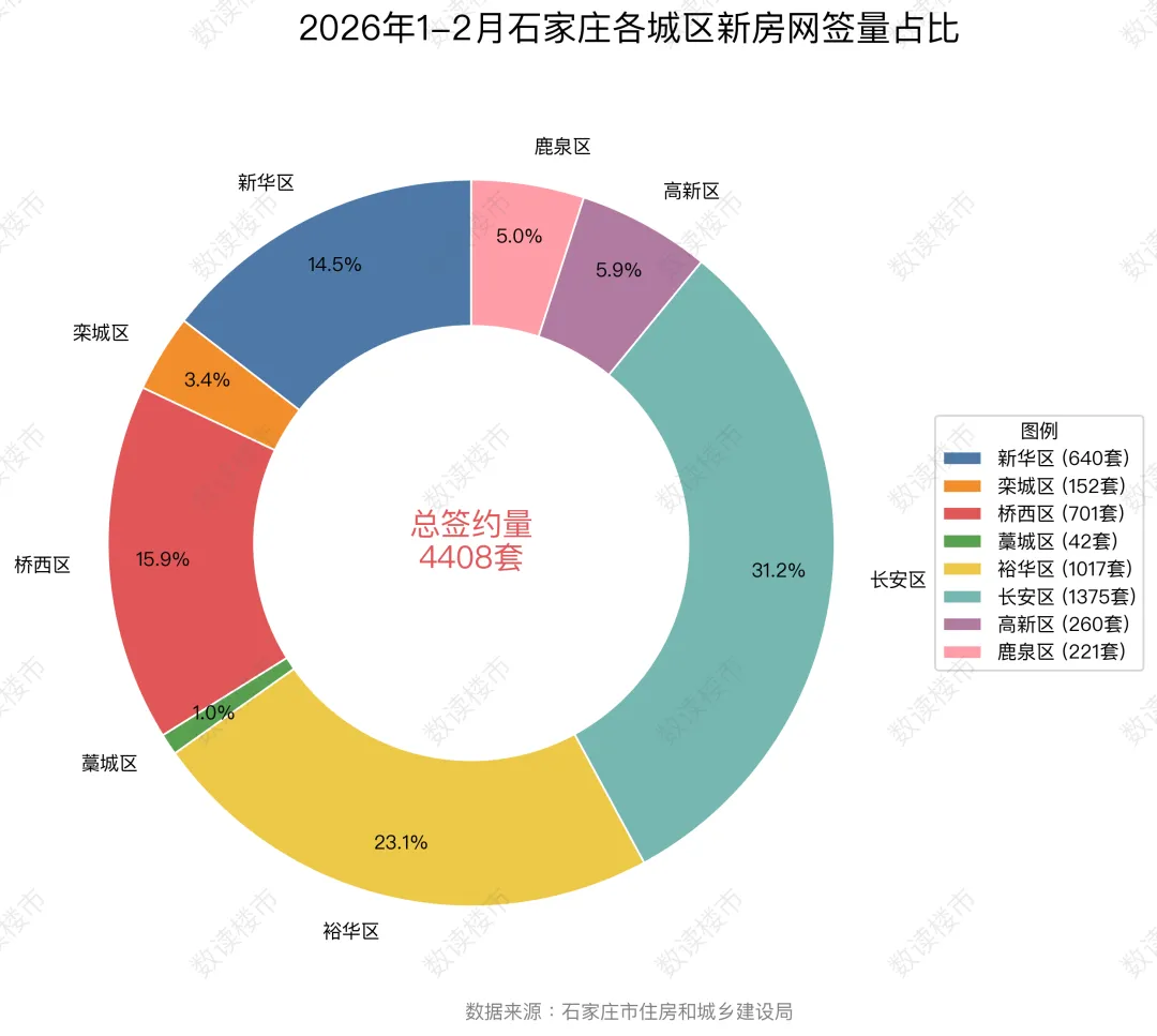 下图为石家庄2026年1-2月各城区新房签约统计图:2026 年 1-2 月,石家庄全市新房总签约量为4408 套,各城区市场表现差异显著,呈现出核心城区主导、外围城区占比较低的格局。长安区、裕华区、桥西区、新华区四大核心城区合计签约量占比达84.7%,新房市场高度集中于主城区。- 长安区以 1375 套、占比 31.2% 位居全市第一,是绝对的成交主力区域,市场热度最高;