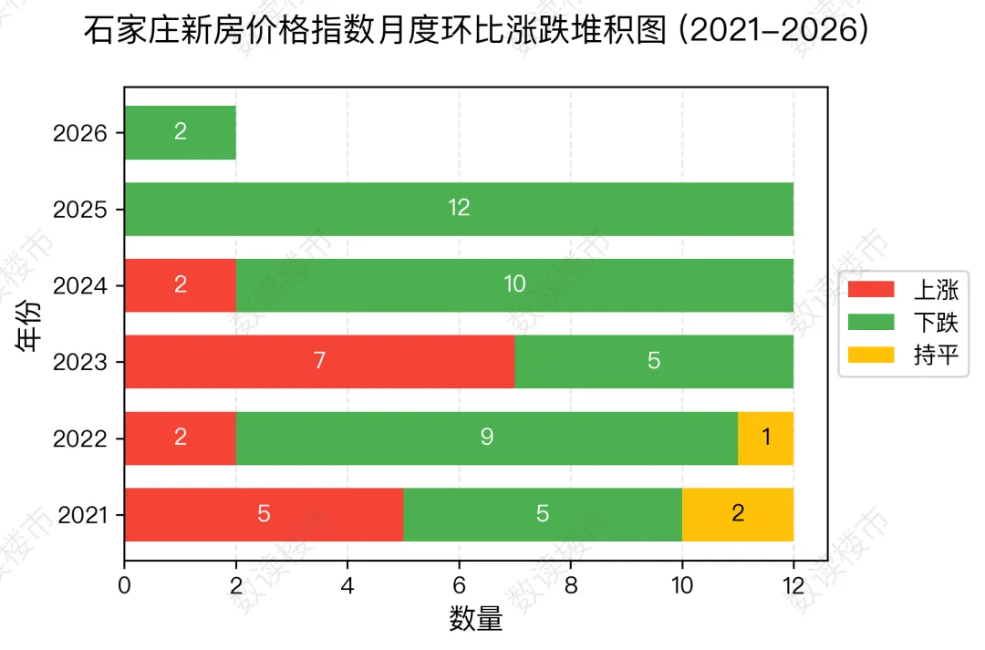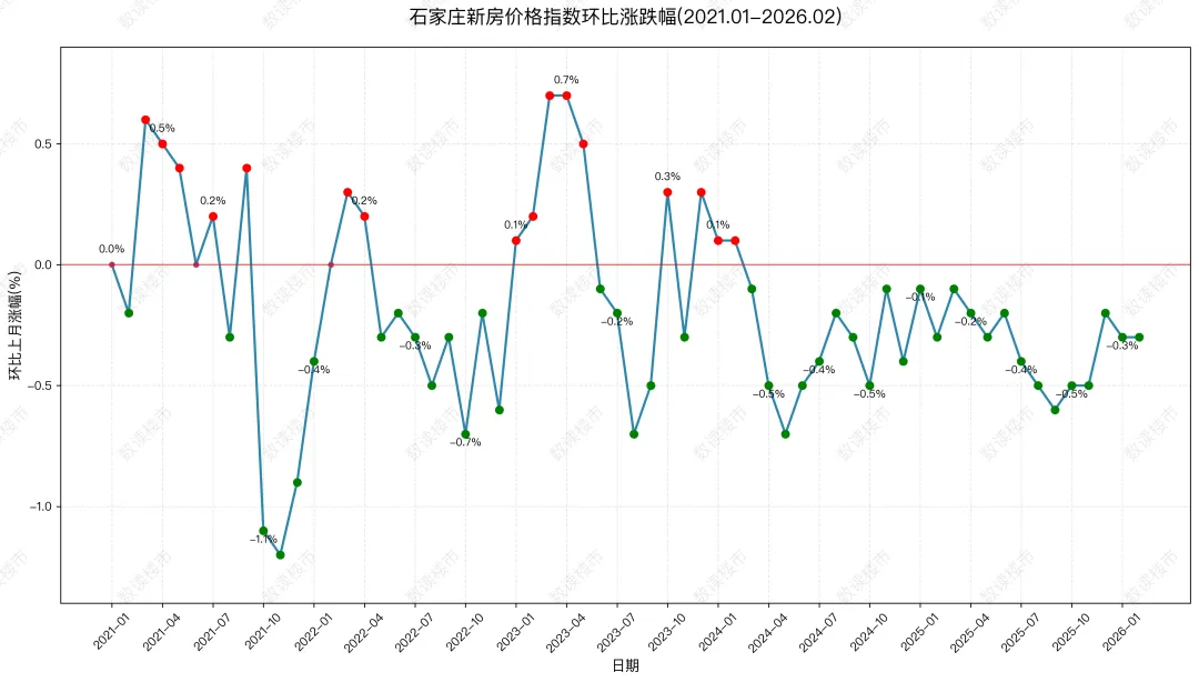 下图为 2021年1月至2026年2月石家庄新房价格指数月度环比涨跌幅趋势图其中2023年3月与4月环比涨幅最大(0.7%);2021年11月跌幅最大,跌幅达 1.2%。石家庄新房价格自2024年3月份已连续 24 个月呈下跌走势。2026年2月石家庄新房价格指数,环比上月下降 0.3%,跌幅与上月持平,同比较下降 4.2%,1-2月平均较去年同期下降4.2%。